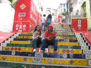De lá fomos conhecer a escadaria mais bonita que já conheci! Fica na escadaria do Convento de Santa Teresa na Lapa. Vale a pena escrever sobre ela. O chileno ceramista Jorge Selarón nascido em 1947 iniciou a colocação dos azulejos em 1994 por causa da Copa do Mundo. Ele veio para o Brasil a procura de trabalho e por algum momento precisou contar com ajuda de pessoas pra conseguir comida e onde dormir. Gostou tanto da hospitalidade do povo que foi erradicado aqui. Ele ainda mora na casa ao lado da escadaria onde vende alguns artesanatos e fica tirando fotos e conversando com os turistas. Muito interessante, vale a pena conhecer. Vídeo da escadaria Selarón.